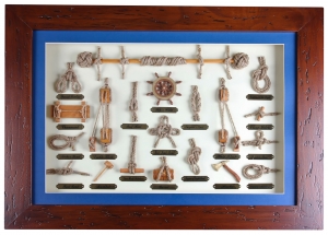 Dekoratif duvar panosu. Gemici düğümleri ve denizcilik donanımları. Ahşap çerçeveli. 60x45 cm.