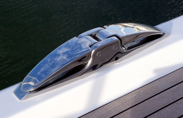 Katlanır baba, model Wing. Parlak polisajlı AISI 316 paslanmaz çelikten üretilmiştir. Açma/kapama mekanizması kazara açılmayı önlemek için egzantirik kilit ile donatılmıştır.